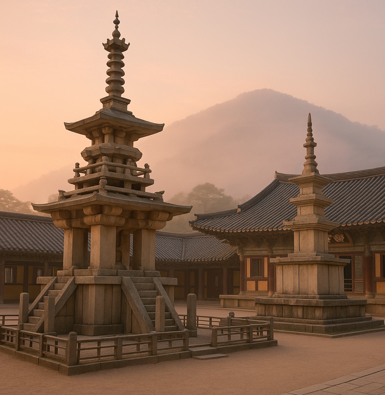 토함산 자락, 바다를 굽어보는 자리에 석굴암이 있다. 새벽빛 속 본존불의 미소는 놀랍도록 고요하다. 전승에 따르면 김대성은 현세의 부모를 위해 불국사를, 전생의 부모를 위해 석굴암을 창건했다. 불국사 대웅전 앞마당에 서로 마주 선 다보탑과 석가탑은 돌의 언어로 진리를 세웠다. 다보탑은 장식과 입체 구성으로, 석가탑은 절제된 비례로 서로의 빛을 더한다. 두 탑의 대비는 화려함과 절제가 공존하는 미감을 드러낸다고 여겨진다.