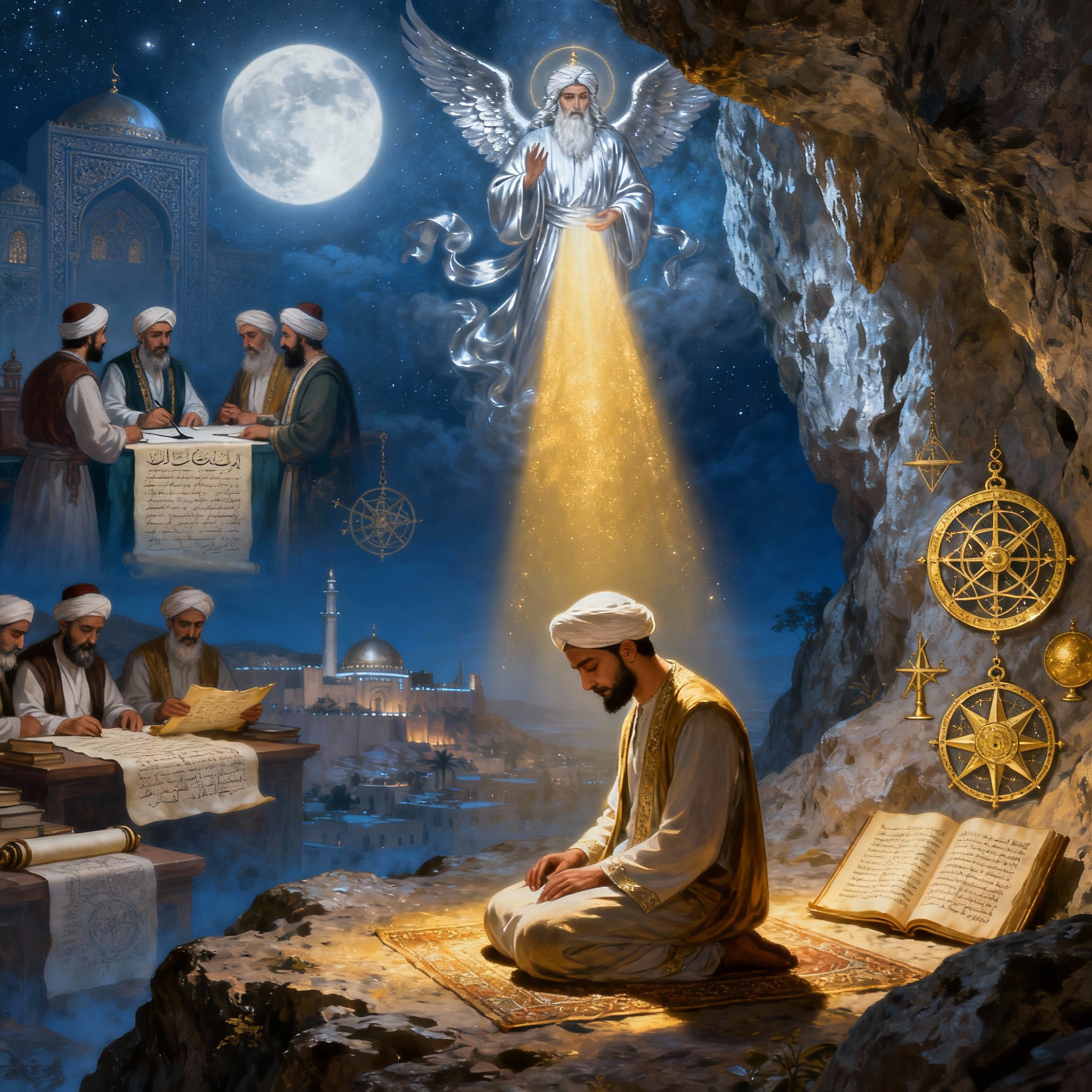 라마단 한밤중, 히라 동굴의 적막을 깨뜨린 것은 천사 가브리엘의 목소리였다. "읽으라, 창조주이신 주님의 이름으로"라는 이 첫 계시는 무함마드에게 엄청난 내적 혼란과 두려움을 안겨주었다. 그는 자신이 읽을 줄 모른다고 세 번이나 대답했지만, 천사는 계속해서 같은 말을 반복했다.
