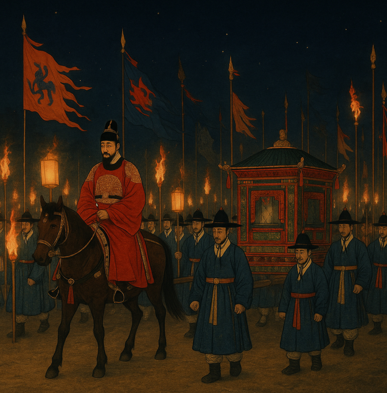 1795년 8일간의 행차는 의장과 진법, 연향과 구휼을 아우른 국가적 무대였다. 의궤는 의복의 색, 의장물의 배치, 행렬의 질서, 연향 절차를 촘촘히 기록해 왕권의 위엄과 백성과의 접촉을 동시에 담아냈다. 밤 연등이 켜진 길 위에서, 정조는 사적인 슬픔을 공공의 기념으로 바꾸며 효를 도성과 백성의 축제로 확장했다.
