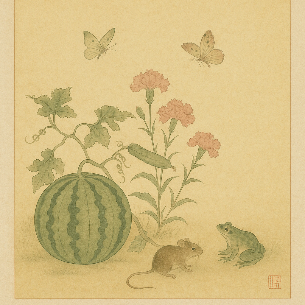 - 수박과 들쥐: 씨 많은 과실과 설치류의 결합은 자손 번창과 풍요를 기원하는 길상으로 읽힌다.