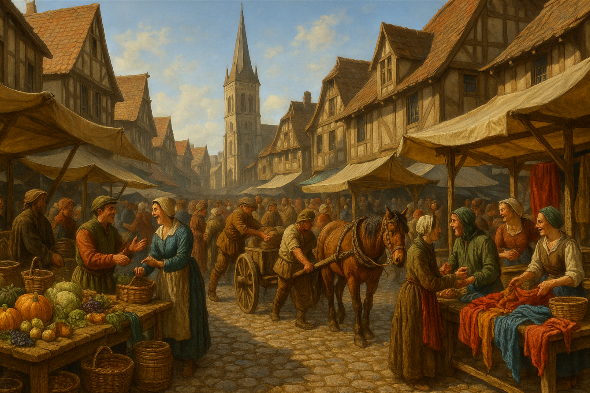 중세 유럽의 아침, 교회 종소리가 울려 퍼지면 도시는 서서히 깨어난다. 돌바닥 위로 수레 바퀴가 덜컹거리는 소리, 상인들이 물건을 늘어놓으며 내는 부산한 움직임, 그리고 이내 시작되는 흥정 소리까지. 장터의 하루가 시작되는 순간이다. 오늘날 우리가 당연하게 여기는 상업 활동의 원형이 바로 이곳에서 태어났다.