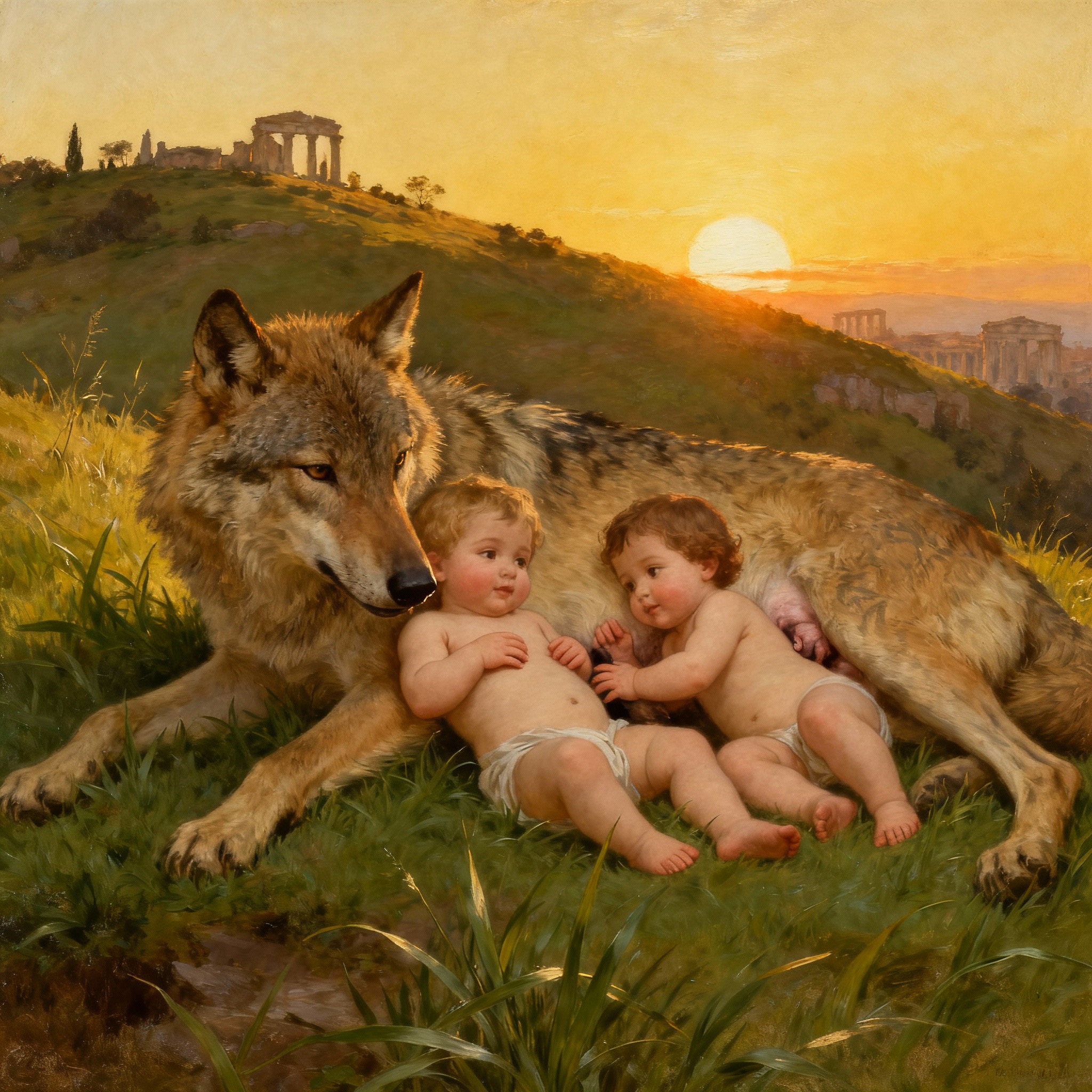 로마 건국 설화의 심장에는 전쟁의 신 마르스와 베스타 신전의 무녀 레아 실비아 사이에서 태어난 로물루스와 레무스가 있다. 대숙부 아물리우스의 음모로 버려진 두 형제는 티베르 강에 떠밀려 나갔다. 기적적으로 강변에 닿은 바구니 속에서 굶주린 암늑대가 울고 있는 아기들을 발견하였고, 본능 대신 연민으로 젖을 물려 키웠다. 이 광경은 야생의 힘과 인류 문명이 만나는 상징적 순간이 되었다.