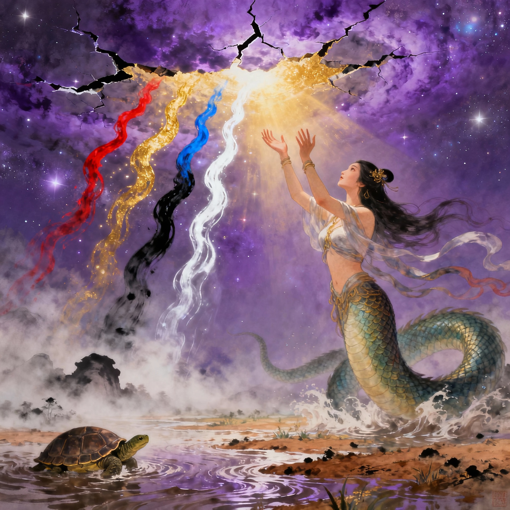 여기서 중국 신화의 가장 신비로운 장면이 탄생한다. <회남자>의 기록에 따르면, 여와는 "위대한 거북"을 찾았다. 그것이 어디에 살고 있었는지, 어떻게 찾았는지에 대한 구체적인 기록은 남아있지 않지만, 우리는 이 여정의 의미를 이해할 수 있다. 여와는 바다에 들어갔을 것이다. 깊은 바다 속으로. 그곳에서 이 거대한 거북을 찾아야 했다.