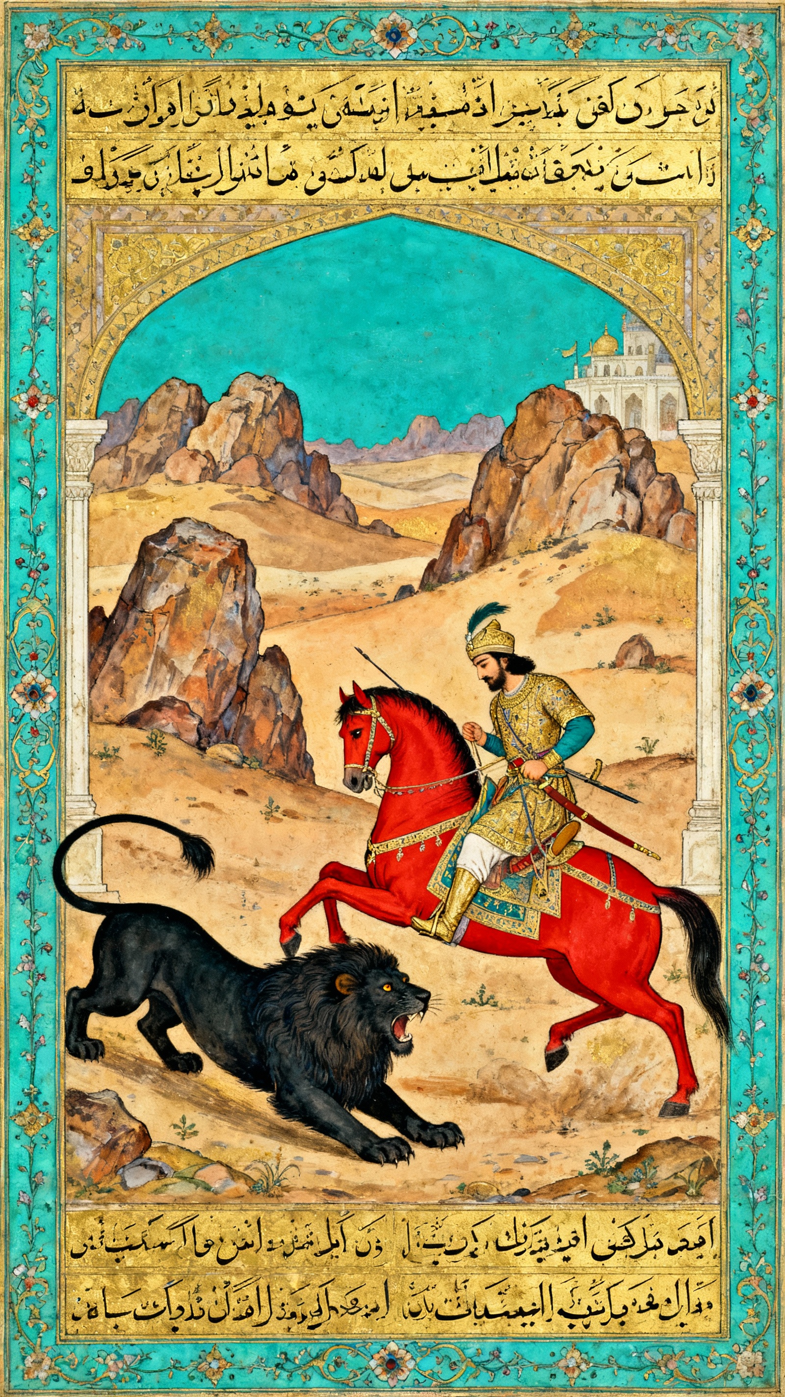 셋째, 용과의 전투 - 가장 유명한 시련이다. 루스탐이 깊은 수면에 빠져 있을 때 용이 나타난다. 라크시가 울음을 질러 깨운 영웅은 용과 벌이는 격렬한 전투 끝에 검으로 용을 관통시킨다. 이 장면은 페르시아 미니어처 화법의 고전적 소재가 되었으며, 무수한 삽화 속에서 루스탐의 영웅성을 상징하는 대표 장면으로 표현되고 있다. 그 미니어처들 속에서 우리는 천 년 전 시인이 본 영웅의 모습을 그대로 만날 수 있다.