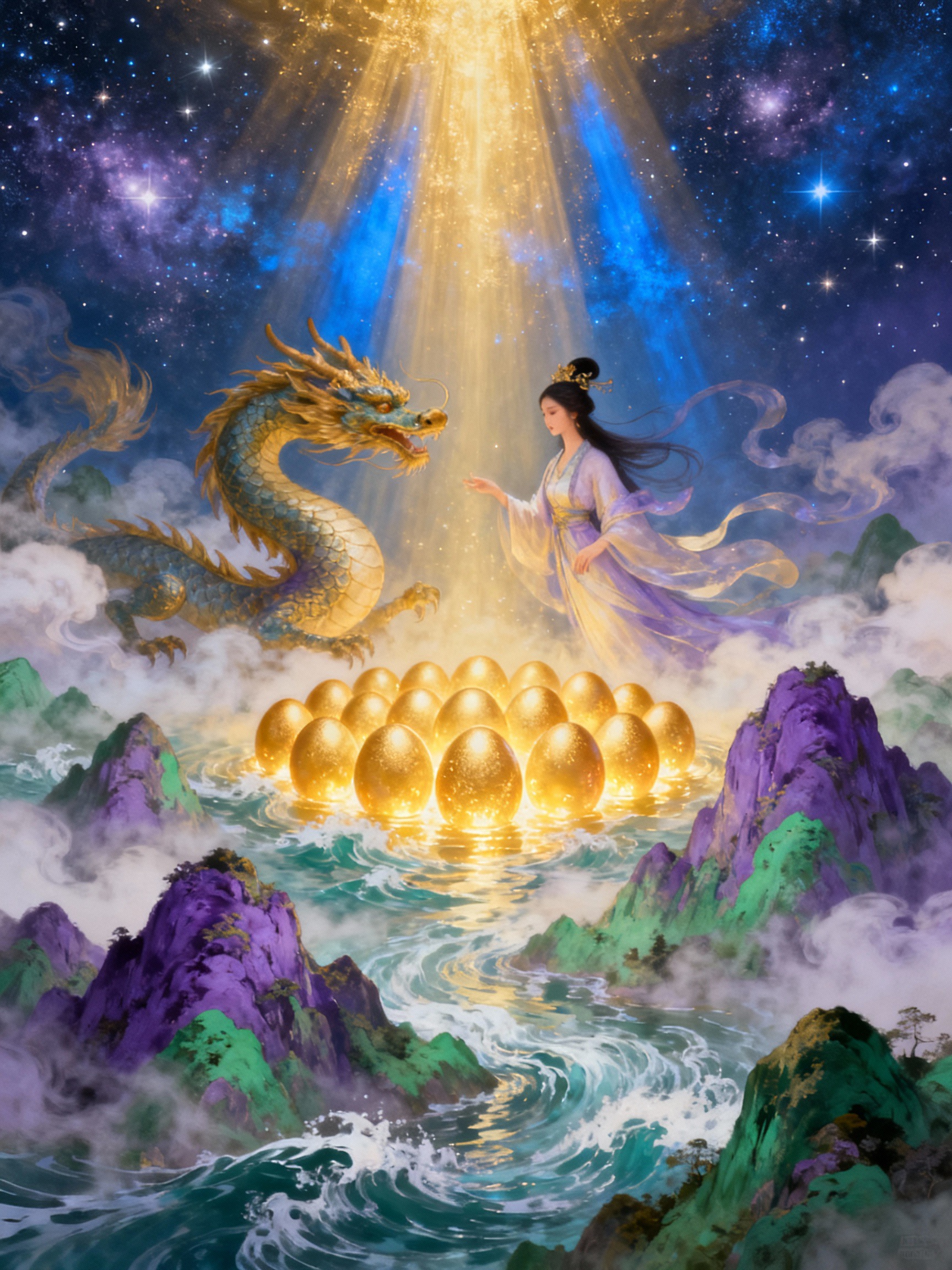 어우 꺼가 임신했을 때, 베트남 대지 위에는 신성한 예감이 감돌았다. 오랜 세월을 기다려온 끝에, 드디어 그날이 찾아왔다. 어우 꺼는 일반적인 아이들을 낳지 않았다. 그녀는 100개의 알이 담긴 주머니를 낳았고, 그 주머니에서 100명의 강하고 찬란한 아들들이 태어났다.